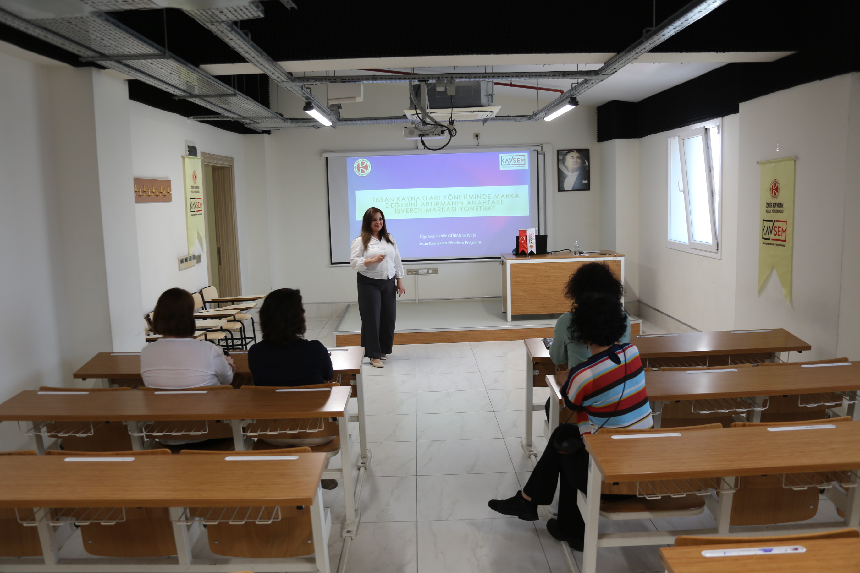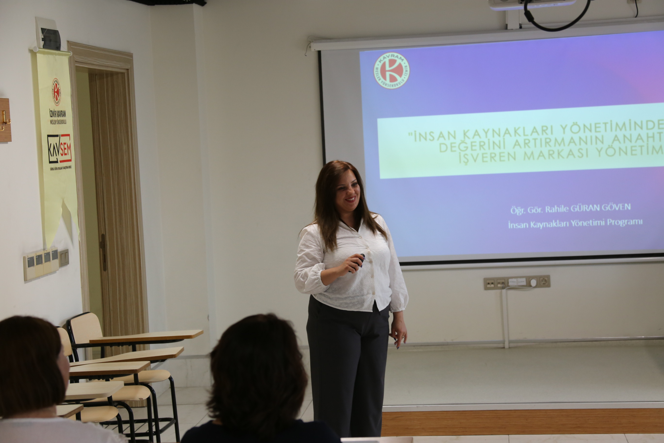 KAVSEM tarafından organize edilen ve İzmir Kavram Meslek Yüksekokulu'nda gerçekleştirilen İnsan Kaynakları Yönetiminde Marka Değerini Arttırmanın Anahtarı: İşveren Markası Yönetimi eğitimi, büyük ilgiyle karşılandı. Öğr. Gör. Rahile Güran Göven tarafından verilen bu eğitimde, işveren markası yönetiminin önemi ve marka değerini artırmadaki rolü üzerine odaklanıldı. Katılımcılar, bu eğitimle işveren markası oluşturma ve yönetme konusunda değerli bilgiler edinerek, insan kaynakları stratejilerini güçlendirme fırsatı buldular.